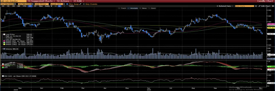 Home Depot hissesi dün 358,03 $’tan kapanarak sınırlı bir geri çekilme gösterdi ve piyasanın temkinli seyrine paralel olarak kısa vadede yatay–düşüş eğilimini sürdürdü. Hisse 50, 100 ve 200 günlük üssel ortalamaların altında kalarak teknik zayıflığın tüm vadelerde devam ettiğini gösteriyor.