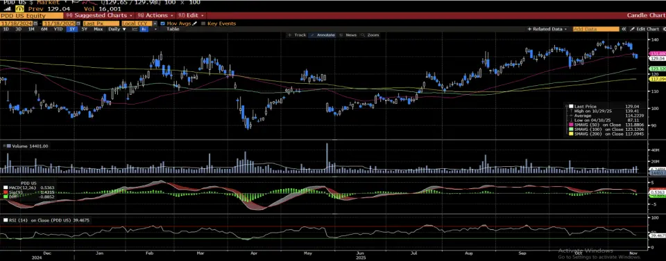PDD Holdings hissesi dün 129,04 $’tan kapanarak hafif geri çekildi; bu zayıf seyirde Çin teknoloji hisselerindeki dalgalanma ve temkinli risk iştahı etkili oldu. Hisse 50 günlük ortalamanın altına inse de 100 ve 200 günlük ortalamaların üzerinde kalarak orta–uzun vadede olumlu teknik görünümünü koruyor. RSI14’ün 39,46 seviyesinde olması satış baskısının azaldığını gösterirken MACD momentumun hâlâ zayıf olduğuna işaret ediyor.