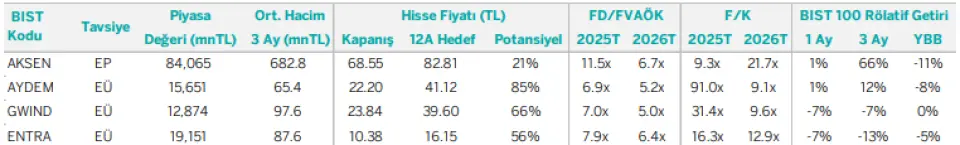 Hisse bazında bakıldığında, AKSEN FVAÖK’ünün büyük bölümünü yurt dışı operasyonlardan ve ikili anlaşmalara dayalı garantili gelir modellerinden elde etmesi sayesinde, yurt içi elektrik piyasasındaki zayıf fiyatlama ortamından görece ayrışıyor. Bu yapı, sektörün baskı altında olduğu dönemlerde şirketi öne çıkarırken, 2025 itibarıyla satın alınmaya başlanan büyüme hikayesinin de değerleme açısından destekleyici olmaya devam ettiğini düşünüyoruz.
