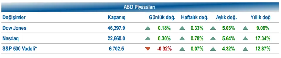 Tahvil faizleri cephesinde 2 yıllık tahvil faizi %3,61, 10 yıllık tahvil faizi ise %4,15 seviyesine yükseldi. Öte yandan, VIX endeksi ise 16,12’den 16,28 seviyesine yükseldi. ABD piyasaları pozitif seyir izledi. Nasdaq endeksi %0,30 artışla 22.660,01 seviyesinden kapanırken, S&P 500 endeksi de %0,41 artışla 6.688,46, Dow Jones endeksi ise %0,18 değer kazancı ile 46.397,89 puandan kapandı."