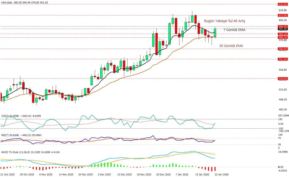 Bakır günlük grafikte son günlerde 585–610 bandında denge arayışı öne çıkıyor fiyat bugün yaklaşık %2,40 yükselişle 591 civarına toparlanarak kısa vadede alıcıların yeniden devreye girdiğini gösteriyor. 7 günlük EMA’nın yeniden yukarı kıvrılması kısa vadeli momentumu desteklerken, fiyatın 20 günlük EMA’nın üzerinde kalması geri çekilmelerin şimdilik “düzeltme” niteliğinde kaldığına işaret ediyor.