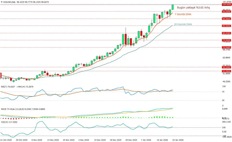 Öte yandan RSI 79 ile aşırı alım bölgesinde seyrettiği için bir miktar uyarı ışığı yakmakta, bu da 100 çevresinde kar realizasyonu riskini artırıyor. Yukarıda 100 bandı ilk direnç alanı, aşağıda ise olası geri çekilmelerde 95 ve 90 seviyeleri kısa vadeli destek, bu bölgelerin üzerinde kalındığı sürece genel resimde yükseliş eğilimi baskın kalmaya devam eder.