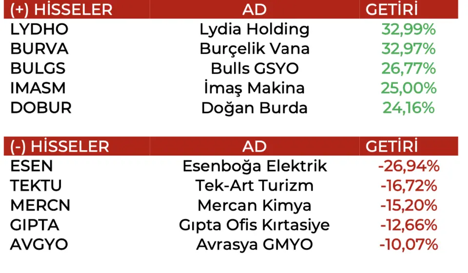 - "2025 yılı 3.çeyrek bilançoların yaklaşık %50’sini aldık . Bilançolar özelinde detaylandırmak gerekirse 2.haftada olumlular bakımından Agesa Hayat Emeklilik, Yapı Kredi Bankası, Gelecek Varlık Yönetimi, Eczacıbaşı Yatırım Holding ve Garanti Bankası öne çıkarken olumsuzlar bakımından ise 1000 Yatırımlar Holding, Türker Proje, Başkentgaz GMYO, Escort Teknoloji Yatırımları ve ICU Girişim gözlerden kaçmadı."