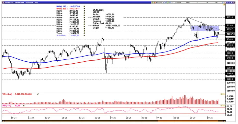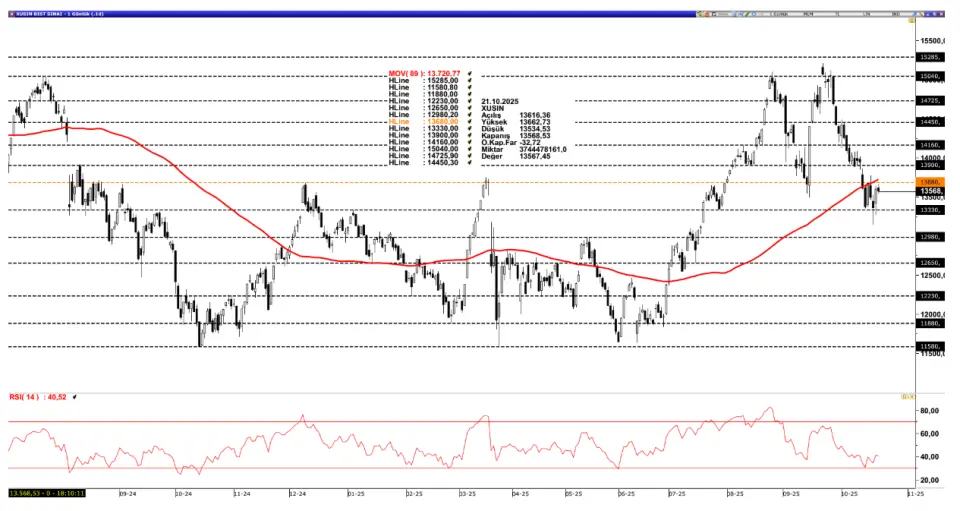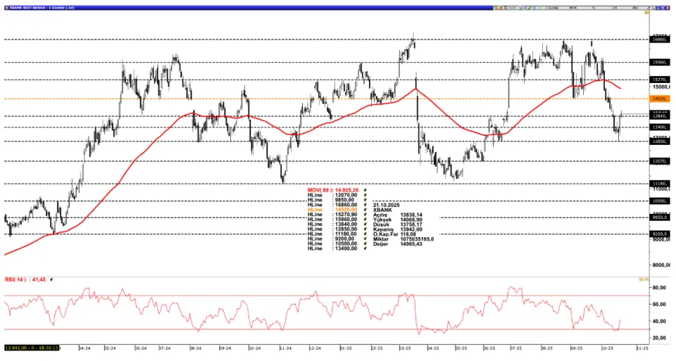 Teknik Görünüm; Son dönemde 16.860 direncinden geri çekilen Bankacılık endeksi, 12.850 seviyesinden gelen tepki alımlarıyla sınırlı bir toparlanma sergilemektedir. Kısa vadede 14.525 seviyesi, yükselişin devamı açısından kritik direnç konumundadır. Bu seviyenin aşılması durumunda 14.925 (89 günlük ortalama) ve 15.270 seviyelerine doğru hareket ivme kazanabilir. Aşağı yönlü olası baskılarda 13.840 – 13.400 aralığı ilk destek bölgesi olarak izlenmelidir. Bu bandın altına sarkılması, 12.850 seviyesinin yeniden test edilmesine ve satış baskısının artmasına yol açabilir. Genel görünümde, 89 günlük ortalamanın altında kalındığı sürece negatif eğilim korunmaktadır.