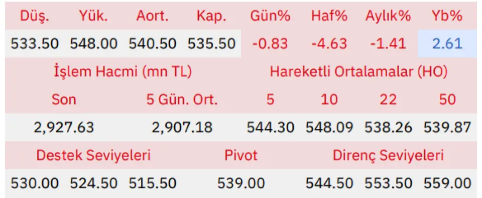 Gün içinde en düşük 533.50 en yüksek 548.00 seviyesini gören BİM Birleşik Mağazalar hissesinin günü %0.83 kayıpla tamamladığı gözlenmektedir. Pivot seviye 539.00 seviyesinden geçmekte olup, aşağı yönlü hareketlerde birinci destek 530.00, ikinci destek ise 524.50 seviyesinden geçmektedir. Dirençler ise sırasıyla 544.50, 553.50 seviyelerinden geçmektedir. Bu aşamada endeksin 5 günlük HO seviyesinin %1.62 altında, 22 günlük HO seviyesinin ise %0.51 altında hareket ettiği dikkat çekmektedir. Son gün işlem hacmi ise bu aşamada 5 günlük ortalama işlem hacminin % 0.70 üstünde gerçekleşmiştir.
