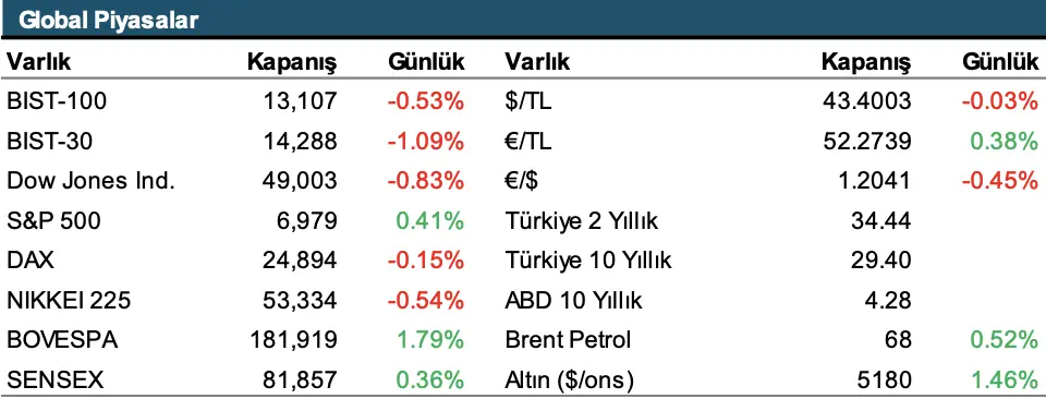 Açılış öncesinde global piyasanın genel görünümüne baktığımızda ise ABD vadelerinin dün kapandığımız saatlerdeki seviyelerine yakın hareket ettiğini gözlemliyoruz. Asya piyasalarında ise Nikkei endeksindeki sınırlı değer kaybına rağmen genel görünümün pozitif olduğunu söyleyebiliriz. Emtia tarafında ise yükseliş eğiliminin etkili olduğu bir güne başlıyoruz. Brent petrol 67 dolar seviyelerinde hareket ederken, ons altın %4’e yakın bir değer kazanımı ile 5.257 dolar seviyelerinden işlem görüyor.