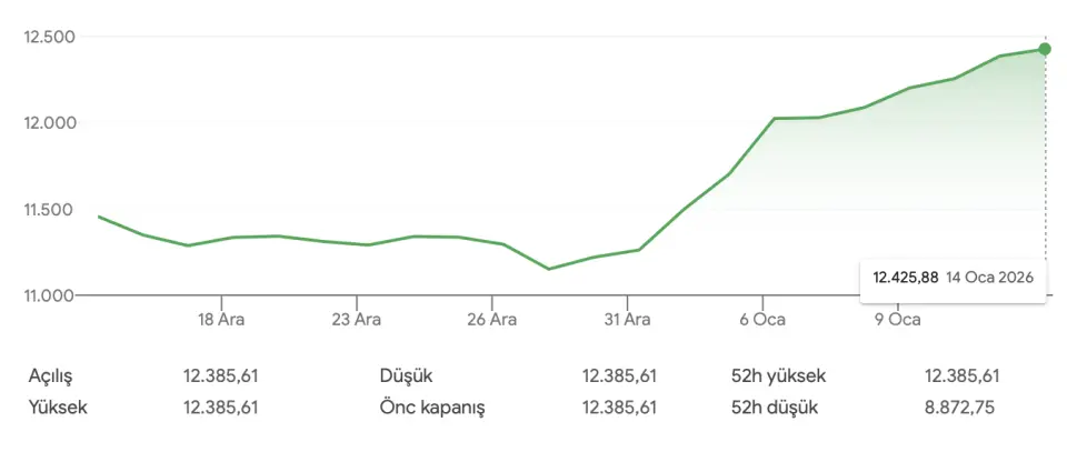 Yeni güne Borsa İstanbul'da BIST 100 endeksi, yüzde 0,33 yükselişle 12.425,88 puandan başlangıç yaptı. Önceki gün alış ağırlıklı bir seyrin hakim olduğu Borsa İstanbul'da BIST 100 endeksi, günü yüzde 1,07 artış ile 12.385,61 puandan noktalayarak tüm zamanların en yüksek günlük kapanışını yaptı. BİST 100, gördüğü en yüksek seviye rekorunu 12.428,44 puana taşıdı.
