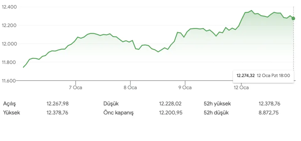 Yeni işlem gününe Borsa İstanbul'da BIST 100 endeksi, yüzde 0,05 yükseliş ile 12.261,38 puandan başlangıç yaptı. Önceki gün alış ağırlıklı bir seyrin hakim olduğu Borsa İstanbul'da BIST 100 endeksi, günü yüzde 0,44 artış ile 12.254,83 puandan tamamlayarak tüm zamanların en yüksek günlük kapanışını yaptı.