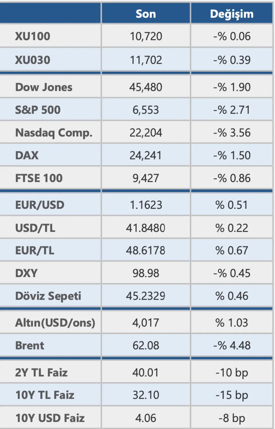 - "Yurt içi piyasalar, katalist eksikliğinin net şekilde hissedildiği geride bıraktığımız haftada oldukça durağan bir seyir izlerken, Borsa İstanbul’un yön tayin etmekte zorlandığını ve fiyatlamaların dar bir bant aralığına sıkıştığını gördük. Haftanın dikkat çeken tek pozitif gelişmesi geri çekilmelerde direnç gösteren endeksin baskıyı 10.700 seviyesinin üzerinde karşılamasıydı. Ancak Cuma akşamı Ankara Cumhuriyet Başsavcılığı’nın, Ankara Büyükşehir Belediyesi'ne yönelik yürütülen konser ve etkinlik soruşturması çerçevesinde İçişleri Bakanlığı'ndan Belediye Başkanı Mansur Yavaş hakkında soruşturma izni talep etmesinden sonra vadeli işlem kontratları %2,85 oranında geri çekildi."