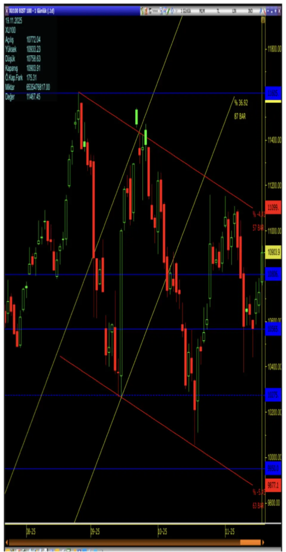- "Olası geri çekilmelerin oluşumu durumunda izlediğimiz seviye olan 10806 seviyesi kısa vadede kritik bir destek noktası olarak dikkat çekiyor. 108006’nın altına sarkması durumunda, 10565 seviyesine doğru geri çekilmeler görülebilir."