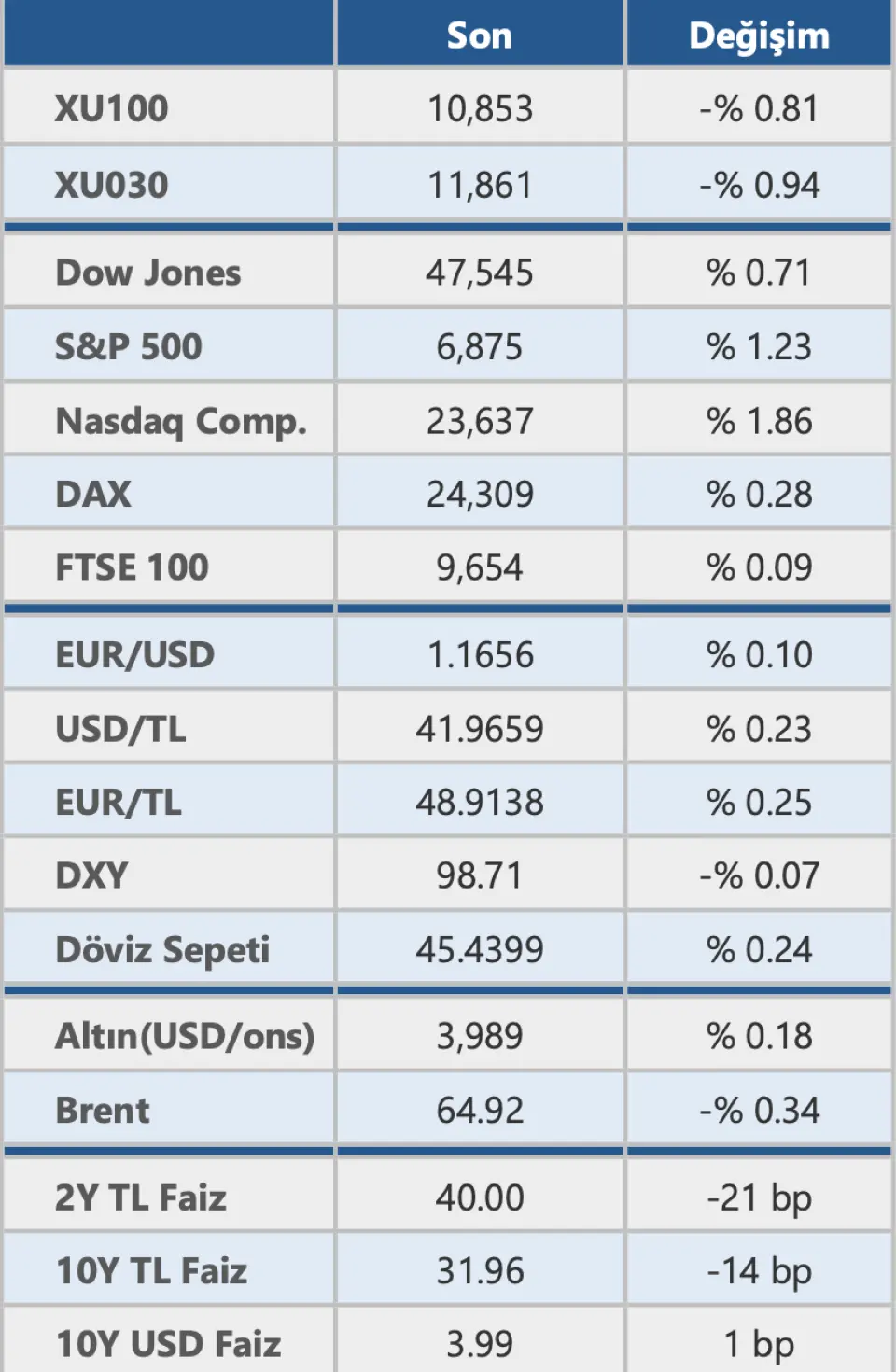 - "Borsa İstanbul’da bugün işlemler Cumhuriyet Bayramı sebebi ile yarım gün ile sınırlı olacak. Piyasaların yarın kapalı olacağını da düşünürsek hareketlilik ve risk alma iştahı limitli seyredebilir. Kaldı ki geçen haftaki %7’yi aşan güçlü performanstan sonra BİST 100 endeksinin yeni haftaya göreceli olarak zayıf bir tonda başladığını gördük. Hisse senetlerinin haber akışına hassasiyeti ise yüksek seyretmeye devam ediyor. Bu noktada yoğun siyasi gündemin yakından takip edildiğinin altını çizmek gerekir. İçeride önemli bir konu başlığının bulunmadığı günde yatırımcıların yön tayin etmek için yurt dışına daha fazla odaklandığını görebiliriz. Dışarıda ana gündem maddesini ise yarın sonuçlanacak olan ve 25 baz puanlık faiz indirimine kesin gözüyle bakılan FOMC toplantısı oluşturuyor. Fed’in faiz indirimlerine devam edeceği öngörüsünün yanı sıra bilanço sezonunun güçlü geçmesi ve ABD-Çin ticaret geriliminin Perşembe günü devlet başkanları düzeyinde gerçekleştirilecek görüşme ile azalacağı beklentisi küresel tarafta genel hatlarıyla iyimser bir eğilim yaratıyor."