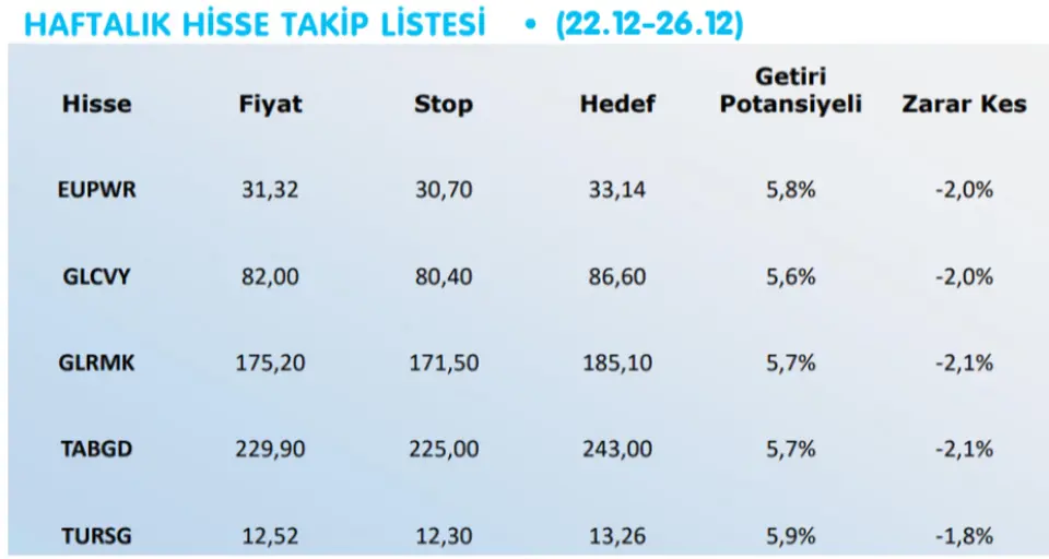 BIST100 endeksi geçtiğimiz haftayı 0,27% yükselişle 11341 puandan tamamladı. Haftaya güçlü alışlar ile başlayan endeks 11470 seviyesini görmesinin ardından haftanın geri kalanında yatay negatif bir seyir izledi. Günlük ortalama işlem hacmi ekim başından bu yana en düşük seviyelerde gerçekleşti. Yeni haftada ana gündem yurt içinde asgari ücret ve ekonomi yönetiminden gelen mesajlar olacak. Yurt dışında ise noel tatili sebebiyle kısa bir hafta olacak. Yurt dışı piyasaların kapalı olduğu günlerde pozitif seyir görülebilir ancak devamında endeks vadeli kontratta vade geçişi işlemleri de önemli olacak.