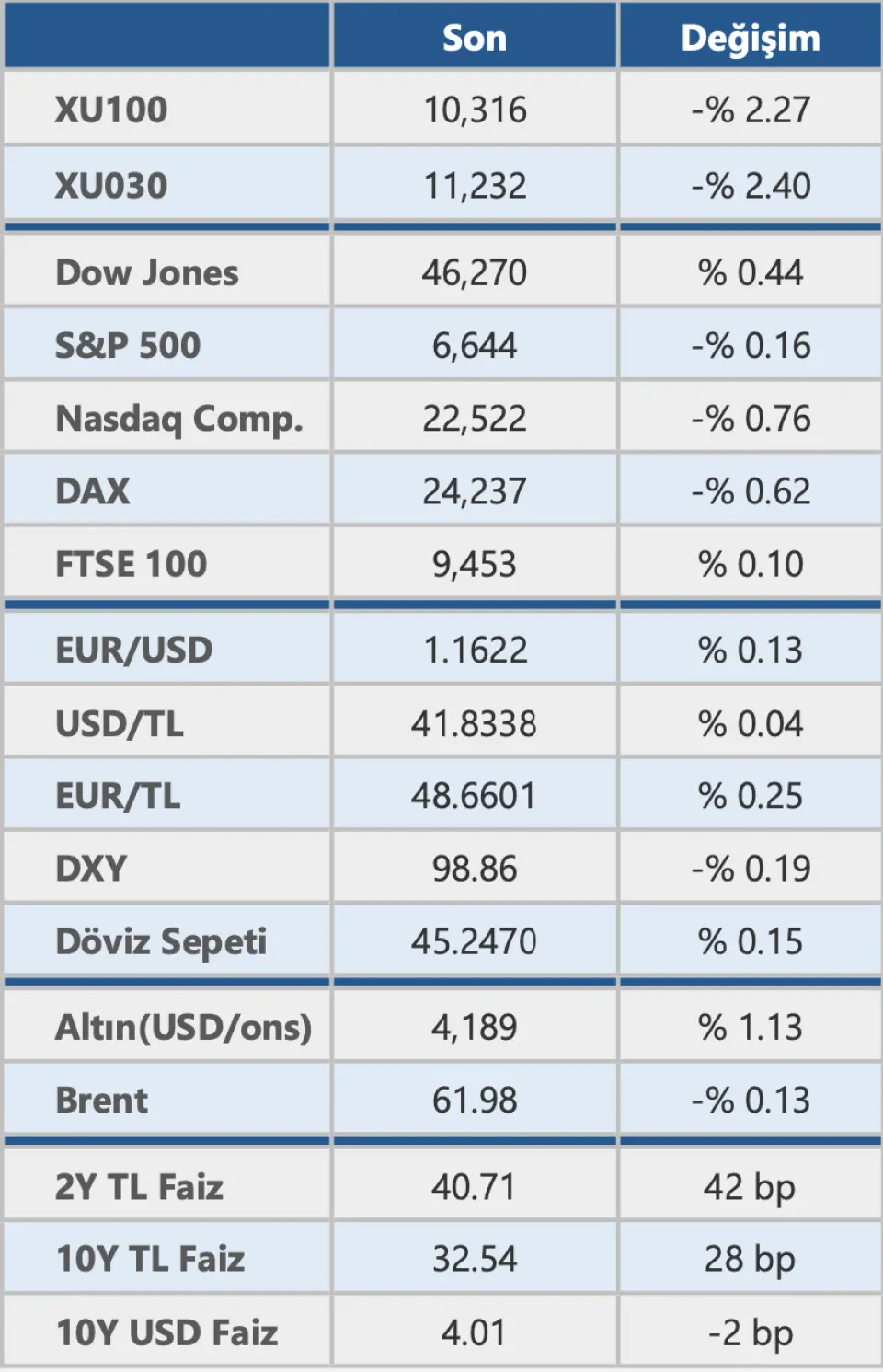- "Ayrıca Pazartesi günü göreceli olarak dirençli bir tablo çizen yurt dışı piyasaların bu defa zayıf bir performans sergilemesi de destek bulunmasını önemli ölçüde zorlaştırdı. Kapanış seviyeleri baz alındığında BİST 100 endeksinin Eylül'de gördüğü zirveden yaklaşık 1150 puan aşağıda olduğunu düşünürsek tepki alımlarına kapı elbette ki açık. Ancak haber akışına hassasiyetin yüksek olduğu içinde bulunduğumuz dönemde katalist eksikliğinin de net şekilde hissedildiğini vurgulamak gerekir. Hisse senetleri için en güçlü destekleyici unsurlardan biri olan faiz indirimi beklentileri korunuyor olsa da yüksek Eylül ayı enflasyon rakamından sonra tahminler törpülenmiş durumda."