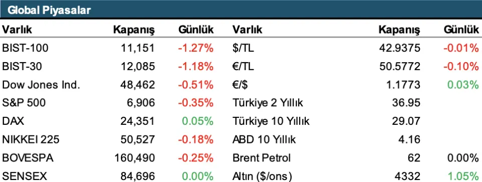Yılın son günlerinde Borsa İstanbul’da hisse bazlı hareketlerin daha ön plana çıktığı ve genel anlamda güç kaybının belirginleştiği bir seyir izliyoruz. Haftanın ilk işlem gününe yatay başlayan BIST 100 Endeksi, gün içerisinde artan satış baskısıyla birlikte geri çekilme eğiliminde hareket etti ve günü %1.27 oranında değer kaybıyla 11,150 seviyesinden tamamladı.