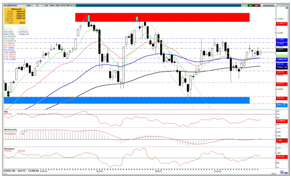 Endeks son günlerde dar bir bant içinde sıkışmayı korurken, 10.800–11.000 bölgesindeki yatay hareket momentum eksikliğine işaret ediyor.