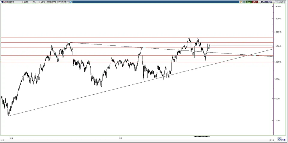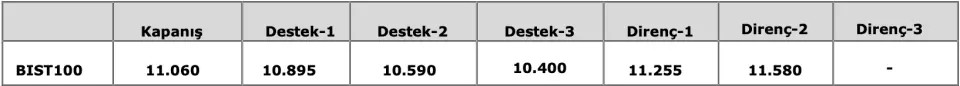 Direncin yukarı yönlü kırılması durumunda ise yatay trend direnci olan 11.580 seviyesi hedeflenebilir. Aşağı yönlü hareketlerde ilk etapta yatay trend desteği olan 10.895 seviyesi izlenebilir. Desteğin aşağı yönlü kırılması durumunda alçalan trend desteği olan 10.590 seviyesi hedeflenebilir. Alçalan trendin aşağı yönlü kırılması durumunda ise yatay trend desteği olan 10.400 seviyesi takip edilebilir.