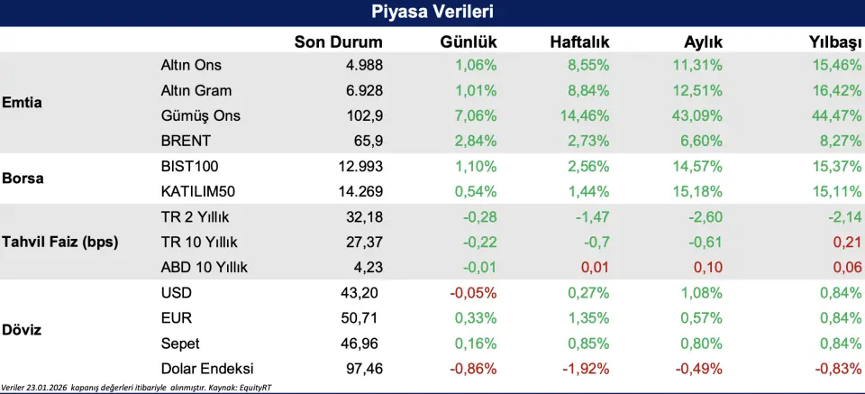 Geçtiğimiz hafta altın piyasasında sert yükselişler görüldü; ons altın %8,55 artışla 4.988 dolar, gram altın ise %8,84 değer kazanarak 6.928 TL seviyesinden kapanış yaptı. ABD Başkanı Trump’ın, ulusal güvenlik gerekçesiyle Grönland’a sahip olma konusundaki ısrarı ve bu durumun Avrupa Birliği ile yarattığı gerilim, ons altında tarihi zirvelerin yenilenmesini tetikledi. Goldman Sachs ise yıl sonu ons altın tahminini 5.400 dolara revize etti. 2026 yılına ait baz senaryomuzda değindiğimiz üzere “kıymetli maden-altın katılım” fonlarımıza, riskleri dengelemek amacıyla %20 civarında yer vermenin uygun olduğunu düşünüyoruz.