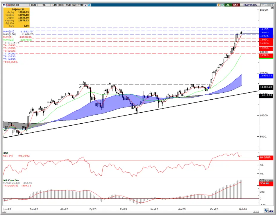 Yukarı yönlü yeni bir denemede 14.000 seviyesi psikolojik eşik olma özelliğini sürdürürken, bu bölgenin aşılması halinde 14.150 bandı kısa vadeli hedef olarak öne çıkıyor.