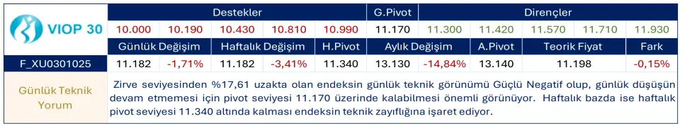 Zirve seviyesinden %17,61 uzakta olan endeksin günlük teknik görünümü Güçlü Negatif olup, günlük düşüşün devam etmemesi için pivot seviyesi 11.170 üzerinde kalabilmesi önemli görünüyor. Haftalık bazda ise haftalık pivot seviyesi 11.340 altında kalması endeksin teknik zayıflığına işaret ediyor.