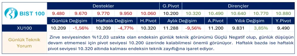 Zirve seviyesinden %12,03 uzakta olan endeksin günlük teknik görünümü Güçlü Negatif olup, günlük düşüşün devam etmemesi için pivot seviyesi 10.200 üzerinde kalabilmesi önemli görünüyor. Haftalık bazda ise haftalık pivot seviyesi 10.320 altında kalması endeksin teknik zayıflığına işaret ediyor.