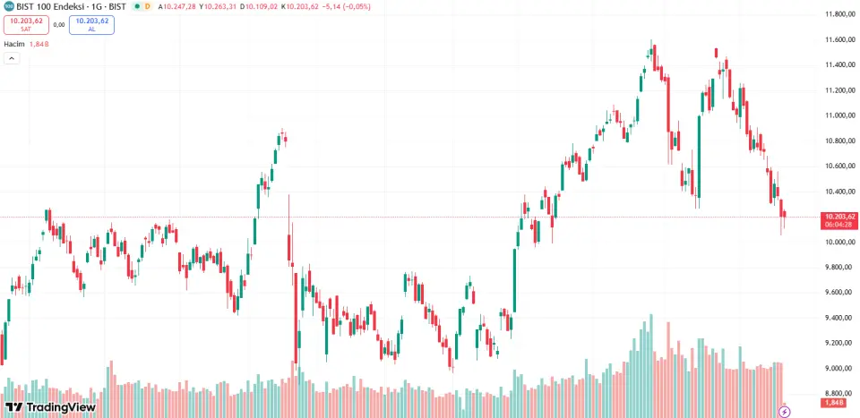 Borsa İstanbul’da BIST100 endeksi, Cuma günü 10.000 seviyesine yaklaşan geri çekilmenin ardından 10.208 puandan kapanış yaptı. Gün içi sınırlı tepki alımlarıyla hafif toparlanma görülse de, hem günlük hem de haftalık teknik görünüm hâlâ zayıf seyrediyor. Tacirler Yatırım’ın değerlendirmesine göre, bugün tepki alımlarının devam edebileceği öngörülürken, 10.200–10.300 ve 10.500–10.600 seviyeleri direnç, 9.950–10.000 ve 9.500–9.600 seviyeleri ise destek alanı olarak takip edilecek.