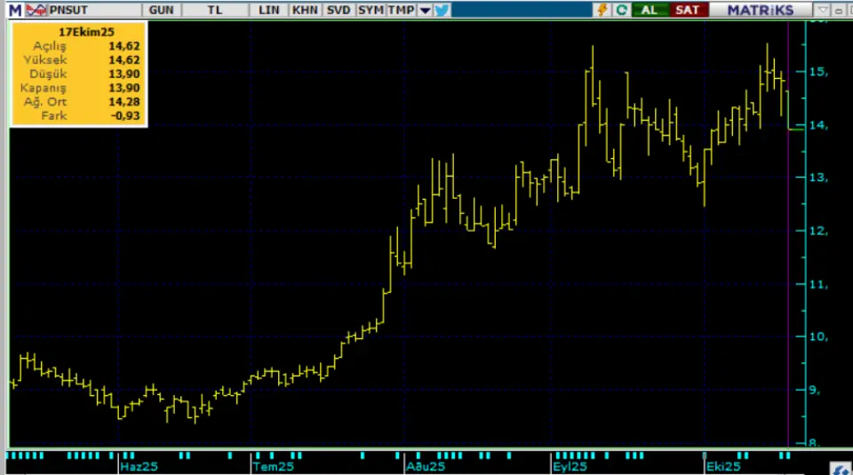Bu düşen piyasada bütün hisseler az ya da çok değer kaybetti. PNSUT de satış yiyen hisselerdendi. Hisse Eylül ayı balarında 15,48 TL zirve fiyattan gelen satışları karşıladı ve 12,44 TL fiyata kadar çekildei. Ancak sonra toparlanan hisse bu günlerde zirve fiyata yakın 15 TL civarı fiyatlardan işlem görüyor.
