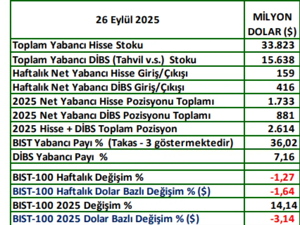 Yabancılar 2024 yılında Hisse ve DİBS’e toplam 13,4 milyar dolarlık net alım gerçekleştirdi. 2025 yılı başından bu yana ise toplam 2.614 milyon dolarlık net yabancı girişi gerçekleşti. Yabancıların toplam Hisse senedi stoku piyasa değeri 26 Eylül 2025 itibarıyla 33,8 milyar dolar olurken, DİBS (repo hariç tahvil) stoku 15,6 milyar dolar oldu.