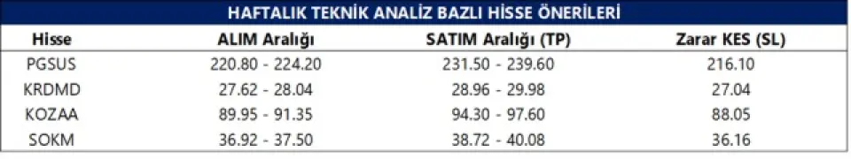 Tacirler Yatırım, yayımladığı günlük bültende yatırımcılar için haftalık teknik analiz bazlı hisse önerilerini paylaştı. Buna göre bu hafta Borsa İstanbul’da öne çıkan hisseler PGSUS, KRDMD, KOZAA ve SOKM olarak belirlendi.