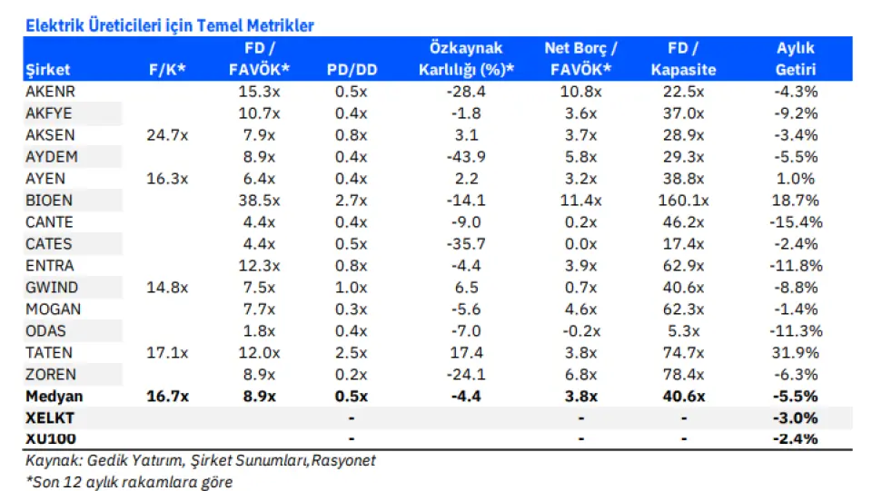 • Aylık üretim verileri bazında, Enka İnşaat %179 ile yıllık bazda en büyük artışı kaydetti, onu Galata Wind (%111) ve Akfen Yenilenebilir (%50) izledi. Buna karşılık, Alarko Holding %9 ile yıllık bazda en büyük düşüşü kaydetti, onu Çan2 Termik (%8) izledi.