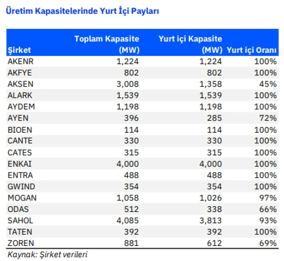 • 3Ç25 verilerine bakıldığında, yıllık bazda en büyük üretim artışı Enka İnşaat'tan (+%157) geldi, onu Galata Wind (+%48) ve IC Enterra (+%48) izledi, Akenerji ise en büyük düşüşü (+%31) kaydetti.