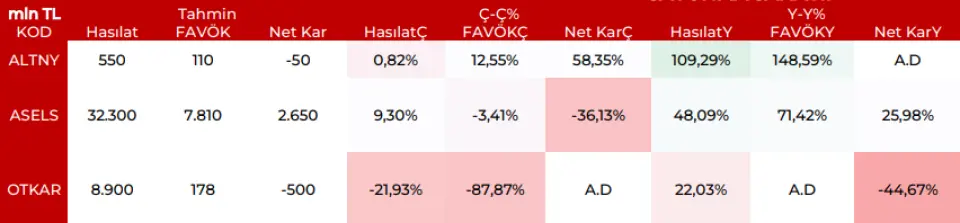 OTKAR: Savunma sanayi iştahıyla birlikte net nette pozitif hasılat ve FAVÖK ivmesi devam ederken net zararın sürmesi açıkçası operasyonel anlamda endişe görünmüyor. İyimser riskler taşımaya devam ediyor.