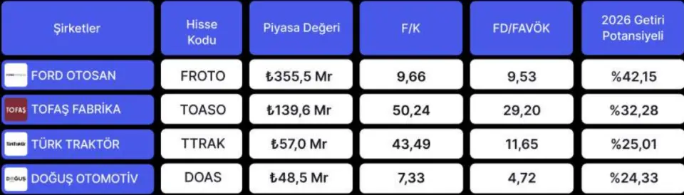 Şirket bazında bakıldığında, Ford Otosan (FROTO) yüksek ihracat oranı ve elektrikli hafif ticari araç segmentindeki güçlü konumuyla sektördeki duruşunu sürdürüyor. Elektrikli araç üretiminin toplam içindeki payının 2026 yılında daha da yükselmesi beklenebilir.