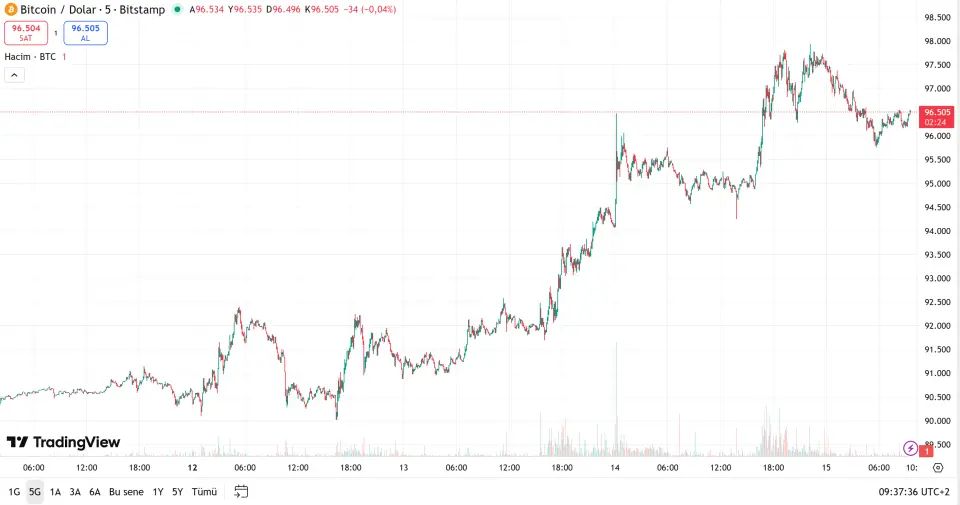 Bitcoin, günün erken saatlerinde 97.735 dolara kadar yükselerek yukarı yönlü denemelerini sürdürdükten sonra 96.336 dolar seviyesine doğru sınırlı bir düzeltme yaşadı. Mevcut fiyatlama, kısa vadede yükseliş eğiliminin korunduğunu ancak ivmenin bir miktar yavaşladığını gösteriyor. 96.000 dolar seviyesi üzerinde kalıcılığın sürmesi, alıcıların piyasadaki ağırlığını koruduğuna işaret ediyor. Yukarı yönlü hareketlerde 97.700 – 98.000 bandı ilk önemli direnç bölgesi olarak öne çıkıyor. Bu alanın aşılması halinde fiyatın yeniden psikolojik 100.000 dolar eşiğine doğru hareket alanı bulması mümkün olabilir. Özellikle hacim destekli kapanışlar, yükseliş momentumunu güçlendirebilir. Olası geri çekilmelerde ise 96.000 dolar seviyesi kısa vadeli ilk destek konumunda. Bu seviyenin altında 95.200 ve 94.500 destekleri takip edilebilir. 94.500 dolar altına yaşanabilecek sarkmalar, kısa vadede düzeltmenin derinleşmesine neden olabilir. Genel teknik görünüm, Bitcoin’in 96.000 dolar üzerinde kaldığı sürece pozitif ve kontrollü yapısını koruduğunu gösteriyor.