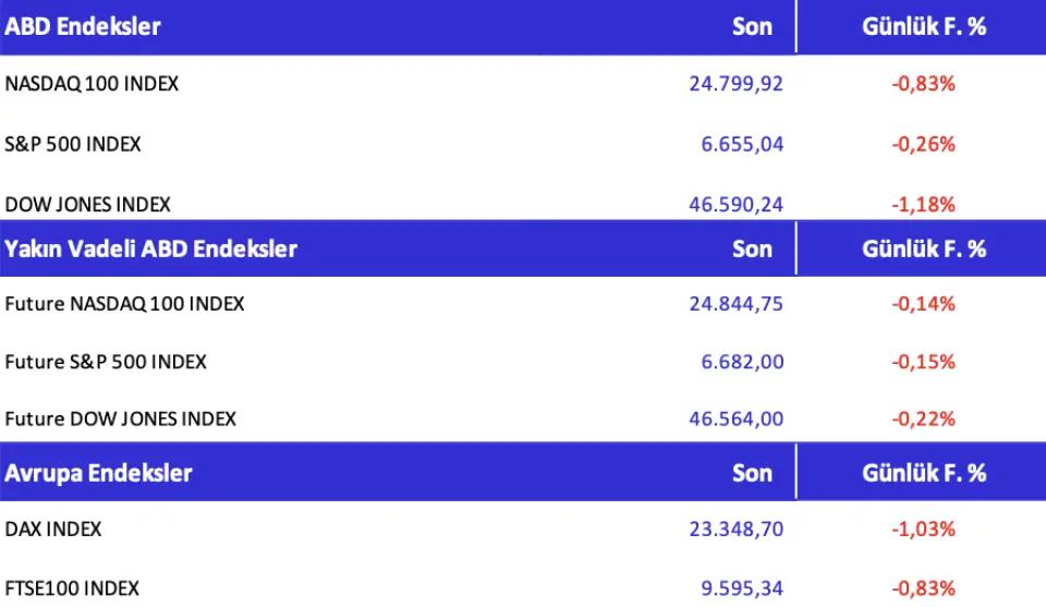 S&P 500 %0,9, Nasdaq 100 %0,8 ve Russell 1000 %1 gerilerken finans sektörü üç gün üst üste değer kaybetti; Coinbase ve American Express öne çıktı. Teknolojide Nvidia, AMD ve Qualcomm düşüş kaydederken, Applied Materials ve Broadcom hafif yükseldi; yazılım ve donanım hisseleri de geriledi. Tüketici hisselerinde Amazon ve Home Depot düştü, Tesla hafif yükseldi. Enerji sektörü %1,8 değer kaybederken, Alphabet %3,1 artışla öne çıktı. Sağlık sektörü yatay, kamu hizmetleri %0,8 prim yaptı.