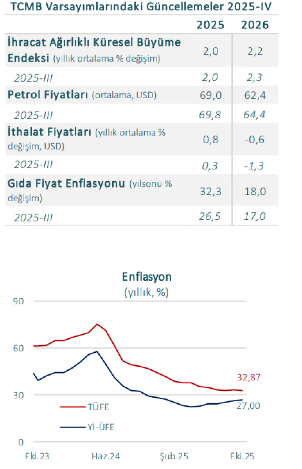 TCMB, bu hafta yılın son Enflasyon Raporu’nu yayımladı. 2025, 2026 ve 2027 yılları için sırasıyla %24, %16 ve %9 seviyesinde bulunan yıllık TÜFE enflasyonu ara hedeflerini koruyan TCMB bu yılsonu için enflasyon tahmin aralığını %25-%29’dan %31-%33’e yükseltti. 2025 yılı için tahmin aralığında yapılan revizyonda gıda fiyatları varsayımındaki artışın önemli rol oynadığı ifade edilirken, çıktı açığının öngörülerin üzerinde seyretmesinin de tahmin aralığını yukarı yönlü etkilediği belirtildi. Maliye politikasının eşgüdümünün dezenflasyon sürecine katkı sağlayacağı varsayımı altında belirlenen orta vadeli tahminler oluşturulurken sıkı para politikasının fiyat istikrarı sağlanana kadar sürdürüleceği bir görünümün esas alındığı ifadesi de yinelendi.