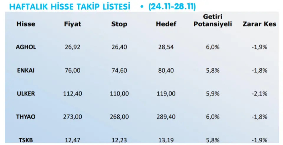 BIST100 endeksi geçtiğimiz haftayı %3,38 yükselişle 10922 puandan tamamlayarak 2 haftalık düşüşün ardından pozitif kapanış gerçekleştirdi. Haftaya alıcılı başlayan endekste 4 gün boyunca pozitif kapanışın ardından, cuma günü haber akışları ve 11 bin direncinin geçilememesi ile satıcılı seyir görüldü. Yeni haftaya başlarken, risk iştahına geçici olarak negatif etki edebilecek bir haber akışı olmasına rağmen, Ukrayna-rusya savaşının bitişine yönelik artan diplomasi risk iştahına destek verebilir. Yapılan görüşmelerin ardından Devlet Başkanlarından gelecek açıklamalar havacılık sektörü öncülüğünde pozitif rüzgar yaratabilir. ABD’de ise hafta Şükran Günü sebebiyle kısa olacak ancak ÜFE başta olmak üzere birçok makro data piyasaların yön arayışına destek verecek. Bununla birlikte bu hafta zayıf gelmesi beklenen kasım ayı TÜFE tahminlerinin belirginleşmesi de piyasaya destek verebilir.