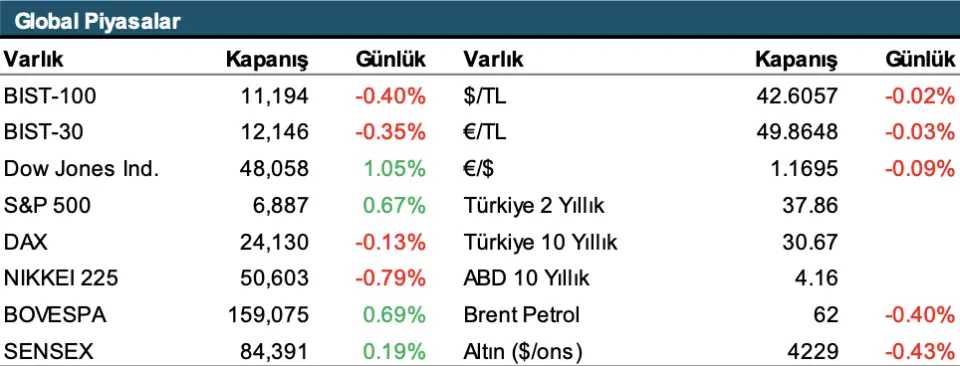 Açılış öncesinde global piyasalara baktığımızda ABD vadeli endekslerinin, dün kapandığımız saatteki seviyelerin hafif üzerinde seyrettiğini görüyoruz. Asya piyasalarında ise zayıf satıcılı bir görünüm hâkim. MTİA tarafında Brent Petrol sabah saatlerinde %0,80 oranında değer kaybıyla 61.90 dolar seviyelerinde işlem görürken, Ons Altın 4.212 seviyesinde hareket ediyor.