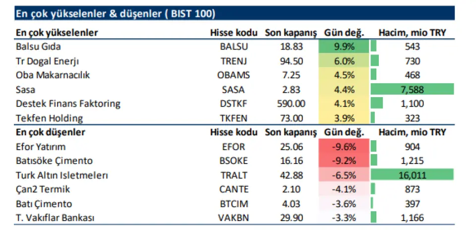 Günlük Bültenimizin ilerleyen sayfalarında detaylı şekilde görebileceğiniz Seçilmiş İndikatörler Puanlama Sistemimize göre bugün öne çıkan ilk 5 hisse senedi: AKSEN, DAPGM, GLRMK, GUBRF ve MAVI. İlgili sayfada sistemimizin metodolojisini ve uyarı notunu okumanızı önemle belirtmek isteriz. Son iş günü kapanışına göre, eşit dağıtım oranı ile oluşturulan Deniz Yatırım Model Portföyümüz günlük bazda %0.27, BIST 100 endeksi ise %0.44 seviyelerinde performans sergilemiştir.