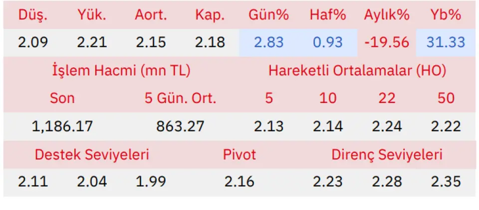 Gün içinde en düşük 2.09 en yüksek 2.21 seviyesini gören Çan2 Termik hissesinin günü %2.83 kazançla tamamladığı gözlenmektedir. Pivot seviye 2.16 seviyesinden geçmekte olup, aşağı yönlü hareketlerde birinci destek 2.11, ikinci destek ise 2.04 seviyesinden geçmektedir. Dirençler ise sırasıyla 2.23, 2.28 seviyelerinden geçmektedir. Bu aşamada endeksin 5 günlük HO seviyesinin %2.35 üstünde, 22 günlük HO seviyesinin ise %2.54 altında hareket ettiği dikkat çekmektedir. Son gün işlem hacmi ise bu aşamada 5 günlük ortalama işlem hacminin % 37.40 üstünde gerçekleşmiştir
