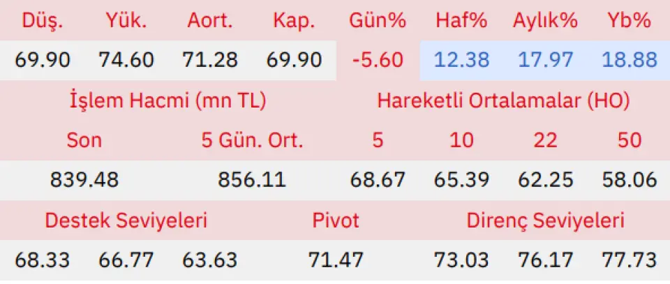 Gün içinde en düşük 69.90 en yüksek 74.60 seviyesini gören Coca-Cola İçecek hissesinin günü %5.60 kayıpla tamamladığı gözlenmektedir. Pivot seviye 71.47 seviyesinden geçmekte olup, aşağı yönlü hareketlerde birinci destek 68.33, ikinci destek ise 66.77 seviyesinden geçmektedir. Dirençler ise sırasıyla 73.03, 76.17 seviyelerinden geçmektedir. Bu aşamada endeksin 5 günlük HO seviyesinin %1.79 üstünde, 22 günlük HO seviyesinin ise %12.30 üstünde hareket ettiği dikkat çekmektedir. Son gün işlem hacmi ise bu aşamada 5 günlük ortalama işlem hacminin % 1.94 altında gerçekleşmiştir.