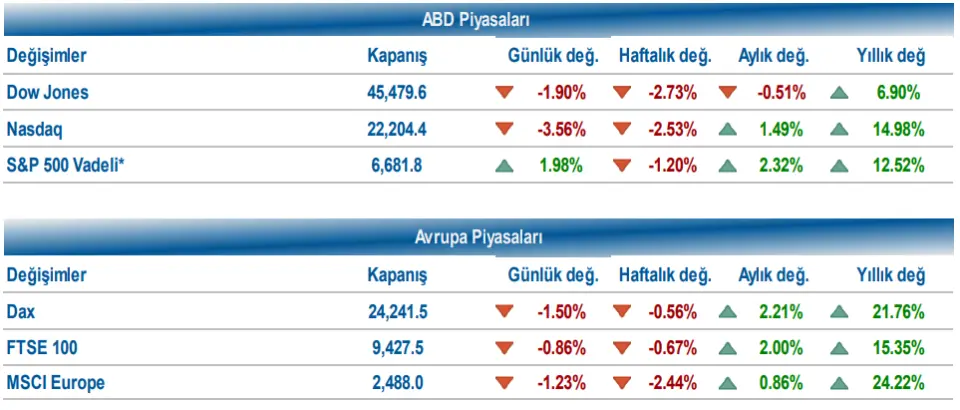 Dow Jones endeksi %1,90 düşüşle 45.479,60, S&P 500 endeksi %2,71 düşüşle 6.552,51 ve Nasdaq endeksi %3,56 düşüşle 22.204,43 puandan günü tamamladı. ABD’de 2 yıllık tahvil faizi %3,50, 10 yıllık tahvil faizi %4,03 seviyesine geriledi. VIX endeksi ise 16,43’ten 21,66 seviyesine yükseldi.