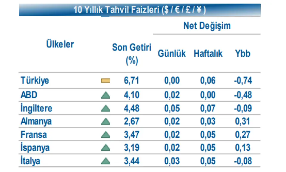 Halk Yatırım yayınladığı tarihli 11 Kasım günlük bültende tahvil ve döviz piyasalarındaki gelişmelere yer verdi. Aracı kurumun analizi şu şekilde:Küresel piyasalarda, veri akışının zayıf olduğu günde tahvil piyasalarında sınırlı satıcılı seyir izlendi. Gün içinde ABD 10 yıllık gösterge tahvil faizi 1 bp artışla %4,10, Almanya 10 yıllık gösterge tahvil faizi 2 bp artışla %2,67 seviyesinden işlem gördü. Türkiye’nin 5 yıllık Dolar cinsi CDS risk primi 2 bp artışla 247 bp seviyesinde işlem görürken, Ocak 2035 vadeli 10 yıllık Eurobond faizi %6,71 seviyesinden işlem gördü. Döviz tarafında, majör para birimlerinin çoğunluğu ABD Dolar’ı karşısında değer kazandı.