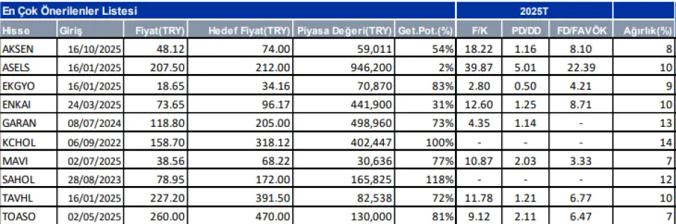 AKSEN, ASELS, EKGYO, ENKAI, GARAN, KCHOL, MAVI, SAHOL, TAVHL ve TOASO.