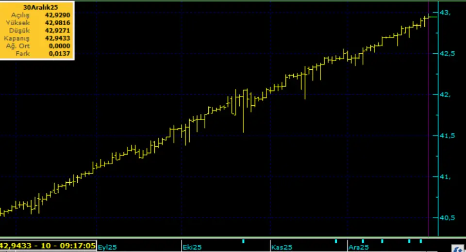 Dolar kuru yılbaşından bu yana yüzde 21 civarında yükseldi. Yılın bu civarda değişimle kapanmasını bekliyoruz. Kurda ılımlı yukarı eğilimi koruyor. Bu sabah 42,94 civarında işlem görüyor. Aşağıda 42,50 ve 42,30; yukarıda 43,00 ve 43,50 öne çıkan teknik seviyeler.