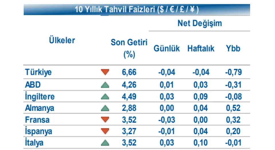 Veriler sonrası tahvil piyasalarında yatay seyir izlendi. Gün içinde ABD 10 yıllık gösterge tahvil faizi 1 bp artışla %4,26, Almanya 10 yıllık gösterge tahvil faizi %2,88 seviyesinden işlem gördü.