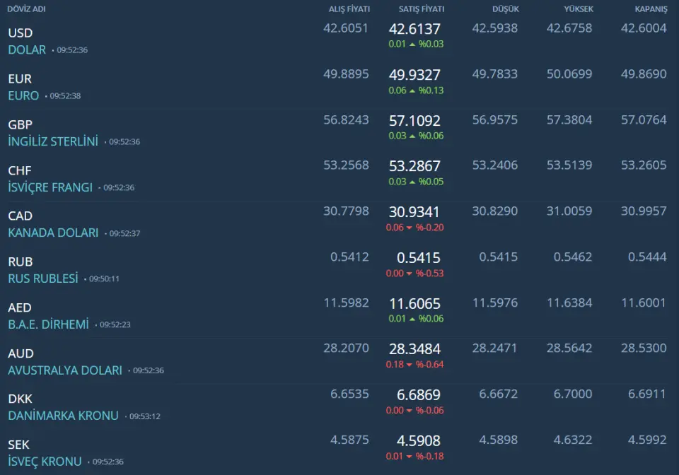 Kurda ılımlı yukarı eğilimi koruyor. Bu sabah 42,61 civarında işlem görüyor. Aşağıda 42,30 ve 42,00; yukarıda 42,70 ve 43,00 öne çıkan teknik seviyeler.