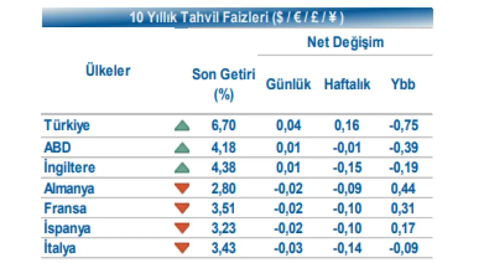 Halk Yatırım yayınladığı tarihli 13 Ocak günlük bültende tahvil ve döviz piyasalarındaki gelişmelere yer verdi. Aracı kurumun analizi şu şekilde:Küresel tarafta, ABD enflasyon verisi öncesi tahvil piyasalarında satıcılı bir seyir izlendi. Gün içinde ABD 10 yıllık gösterge tahvil faizi 1 bp yükselişle %4,18, Almanya 10 yıllık gösterge tahvil faizi 2 bp düşüşle %2,80 seviyesinde işlem gördü. Türkiye’nin 5 yıllık Dolar cinsi CDS risk primi 217 bp seviyesine yükselirken, Eylül 2035 vadeli 10 yıllık Eurobond faizi %6,70 seviyesinden işlem gördü. Döviz tarafında, majör para birimleri ABD Dolar’ı karşısında çoğunlukla değer kaybetti. Dolar Endeksi 98,802 seviyesine düşerken, Euro / Dolar paritesi 1,1661 seviyesine yükseldi. Dolar / TL spot kuru ise 43,13 seviyesinden işlem gördü.