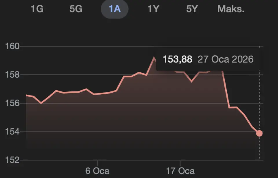 Dolar/Japon Yeni kapanışla birlikte %0.6 düşüş gerçekleştirdi. Güne 154,12 seviyesinde başladı ve gün içinde en yüksek 154,45, en düşük 154,08 seviyesinden işlem gördü. Kapanışı ise 154,26 seviyesinde tamamladı. 5 iş gününe göre hesaplanan hareketli ortalamaya göre olumsuz görünümdedir.