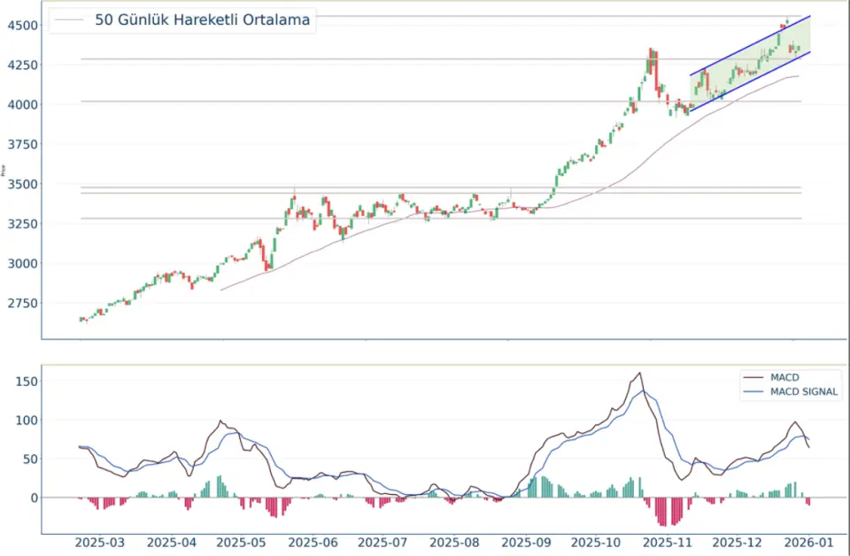 Ons Altın dün gerçekleşen işlemlerde en yüksek 4.369, en düşük ise 4.337 seviyesinde işlem gördükten sonra %0.99 artarak artarak 4.368 seviyesinde günü tamamladı. 20 günlük hareketli ortalamanın altında hareket etmesi ise Ons Altın adına olumsuz olarak nitelendirilebilir. Gün içi işlemlerde 4.325 ve 4.260 desteklerini ve 4.454 ve 4.484 dirençlerini takip edeceğiz.
