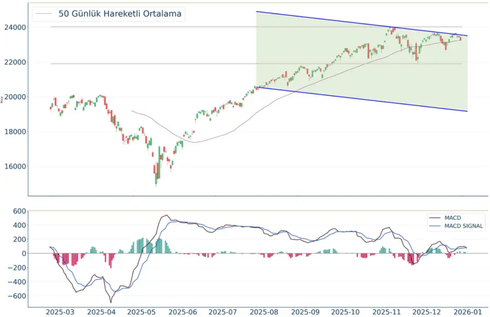 Nasdaq Endeksi geçtiğimiz gün %0.76 azalarak 23.241 seviyelerinden işlem görüyorken 50 günlük hareketli ortalaması olan 23.246 seviyesinin de %0 altında seyrediyor. Bu seviyeye göre Nasdaq Endeksi için orta vadeli pozitif görünüm hakimdir. Destek ve direnç seviyeleri; Son kapanışla birlikte 23.273 desteği kalıcı olamadı ve aşağı yönlü kırıldı. Gün itibarıyla yeni destek olarak 23.108 seviyesi takip ediliyor, ikinci destek seviyesi ise 22.705 oldu. Direnç seviyeleri için ise 23.808-23.938 takip edilecektir.
